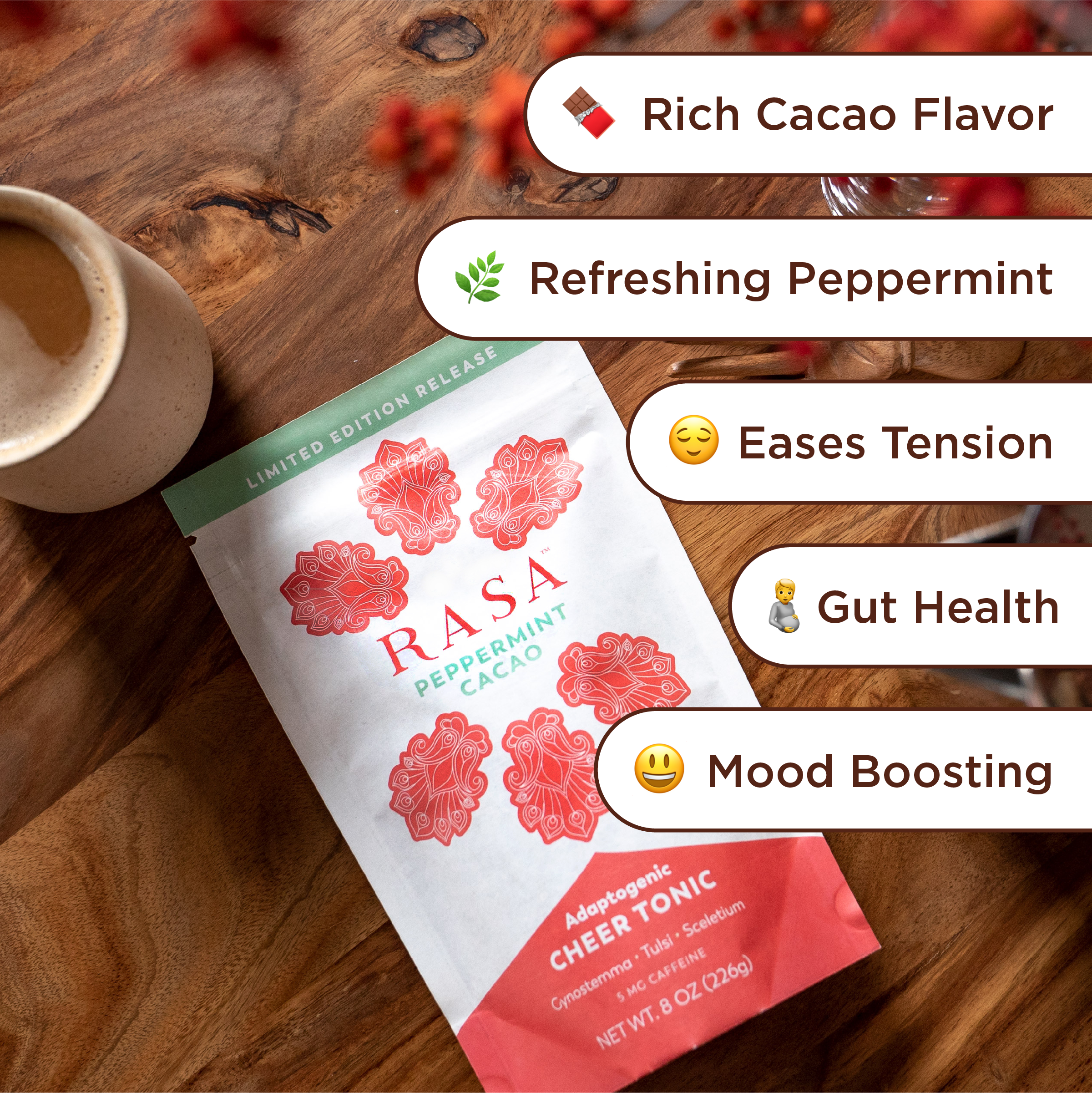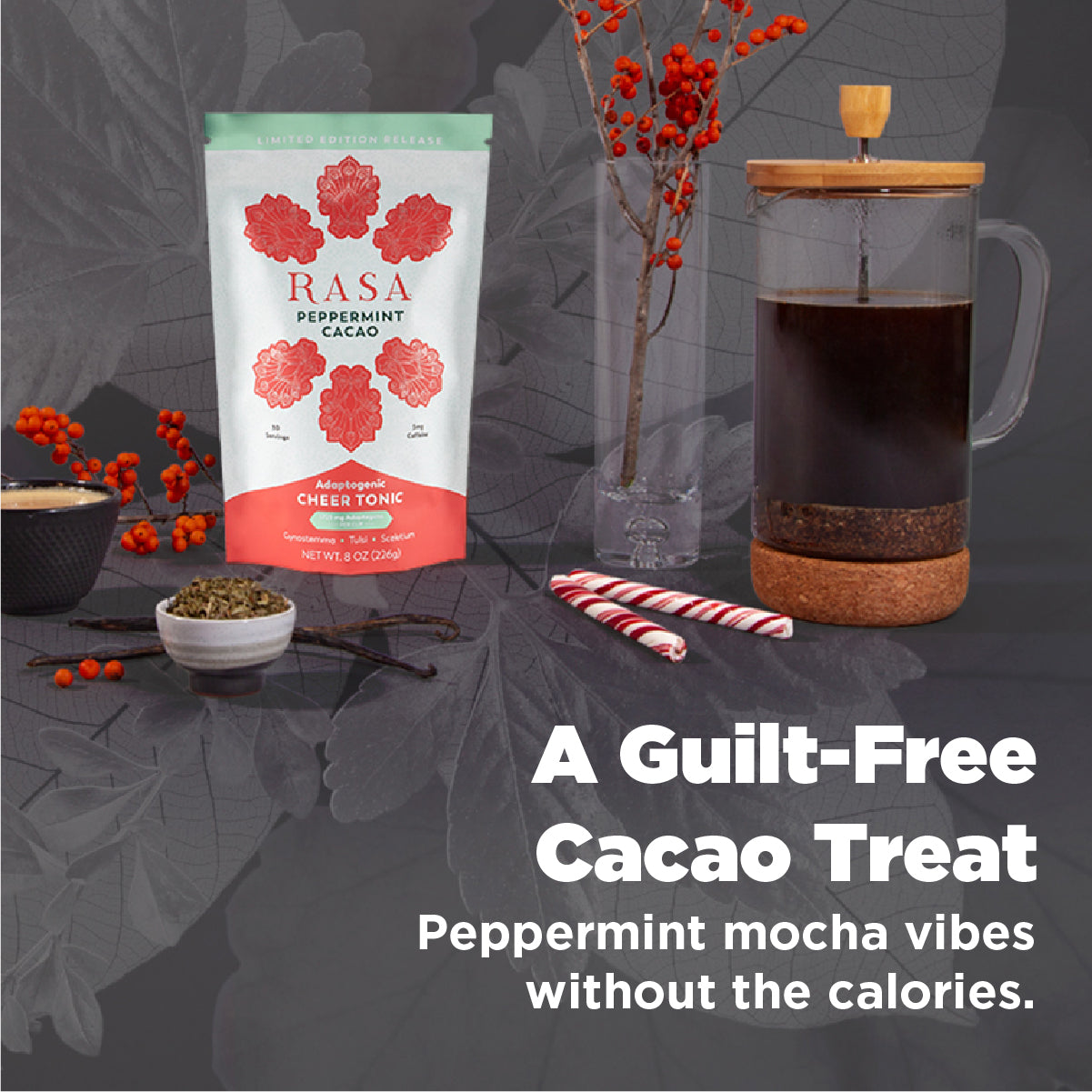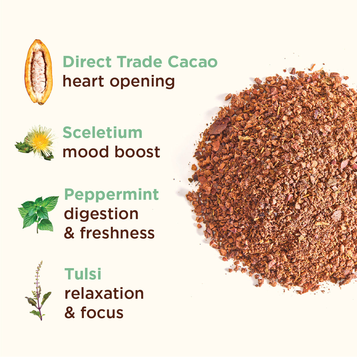 Roasted Cacao*, Roasted Date Seed*, Roasted Chicory*, Roasted Burdock*, Vanilla*, Licorice, Lo Han Guo, Peppermint Oil (Sunflower oil & Peppermint oil)*, Peppermint Leaf*, Tulsi Extract*, Gynostemma Extract*, Sceletium Extract (Zembrin®), <1% Cassava Dextrin* & Maltodextrin