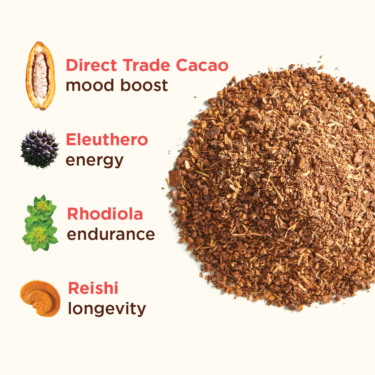 Roasted cacao*, roasted chicory*, roasted burdock*, shatavari*, roasted dandelion*, codonopsis*, eleuthero*, roasted date seed*, roasted maca*, ceylon cinnamon*, ashwagandha*, rhodiola*, chaga mycelium*, & reishi fruiting body extract*‡
