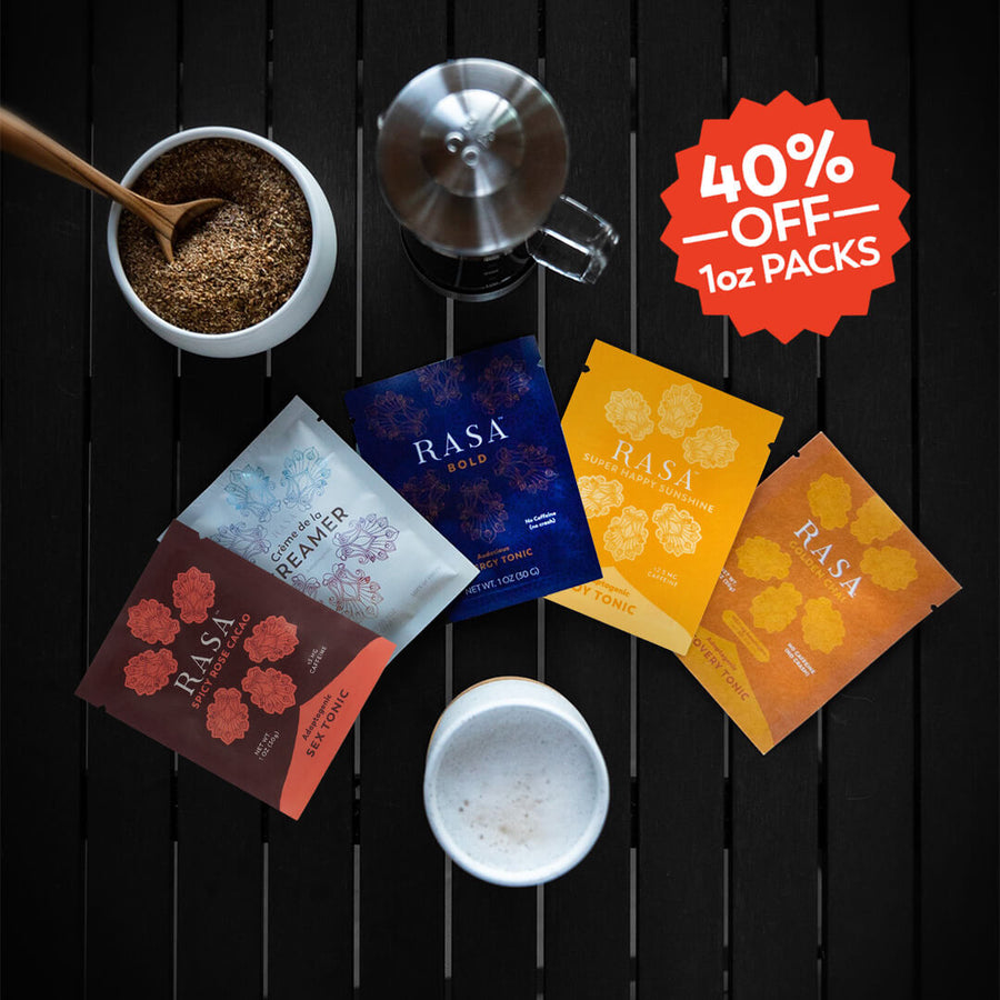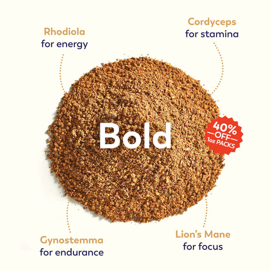 Roasted burdock*, roasted chicory*, roasted dandelion*, roasted cacao*, shatavari*, codonopsis*, eleuthero*, he shou wu*, eleuthero extract*, cordyceps fruiting body extract*<sup>‡</sup>, lion’s mane fruiting body extract*<sup>‡</sup>, schisandra extract*, ceylon cinnamon*, rhodiola extract*, gynostemma extract*, shilajit, chaga mycelium*, contains <1% cassava dextrin*