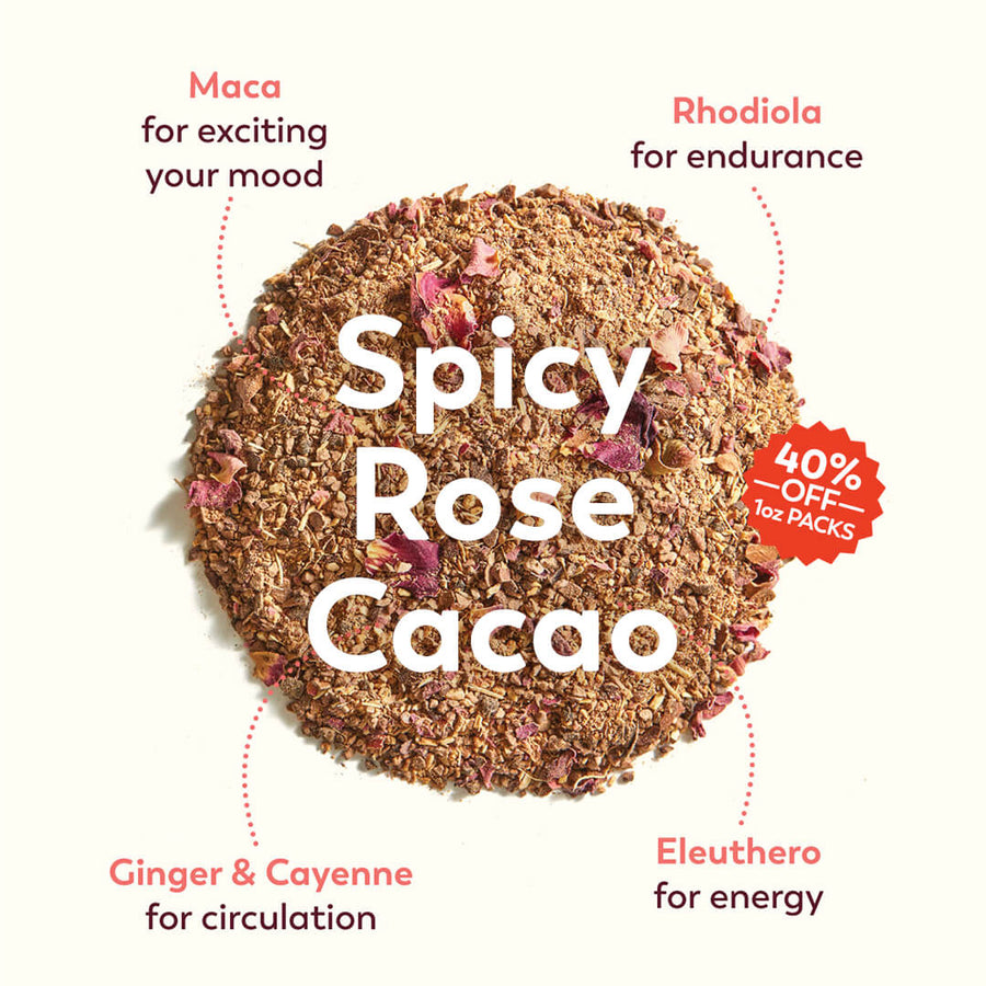 Roasted cacao*, roasted chicory*, roasted burdock*, ginger*, roasted dandelion*, shatavari*, maca extract, rose petals*, codonopsis*, he shou wu*, hawthorn berry*, rose powder*, schisandra extract*, eleuthero*, ashwagandha*, rhodiola*, cayenne*, contains <1% malto and cassava dextrin