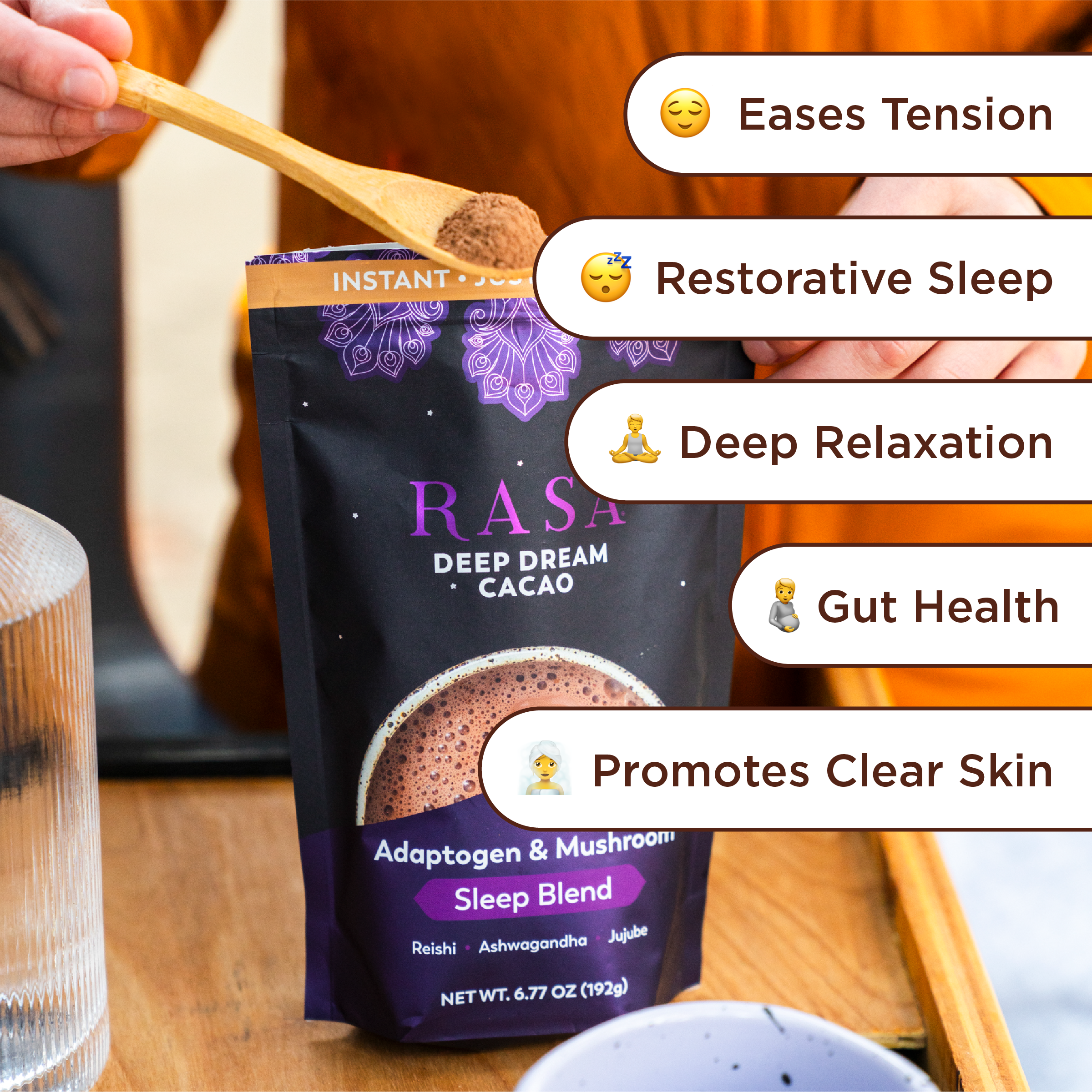 Cacao powder,*† coconut sugar,* KSM-66 ashwagandha extract,* reishi fruiting body extract,*‡ tremella fruiting body extract,* poria fruiting body extract,* jujube seed extract,* jujube fruit extract,* vanilla,* Himalayan salt