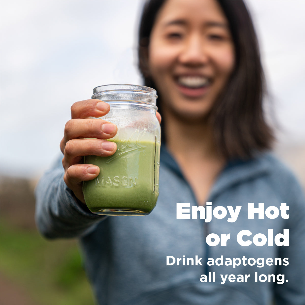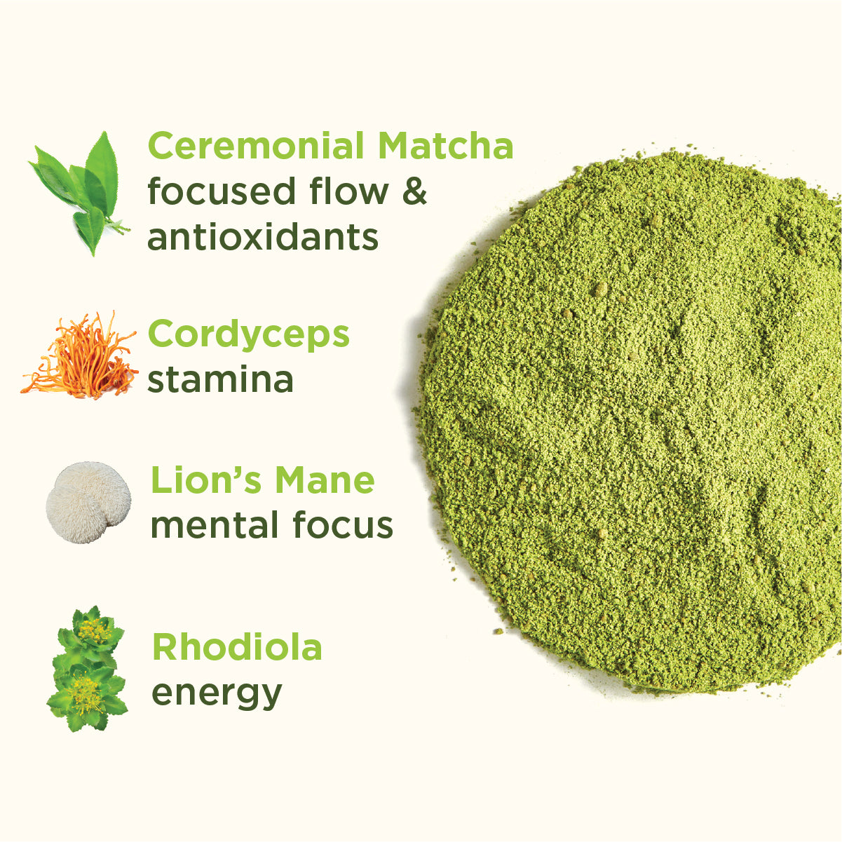 Coconut milk powder* (coconut milk,* tapioca maltodextrin*), matcha,* coconut sugar,* gynostemma extract,* cordyceps fruiting body extract,*† lion’s mane fruiting body extract,*† rhodiola extract,* & eleuthero extract*