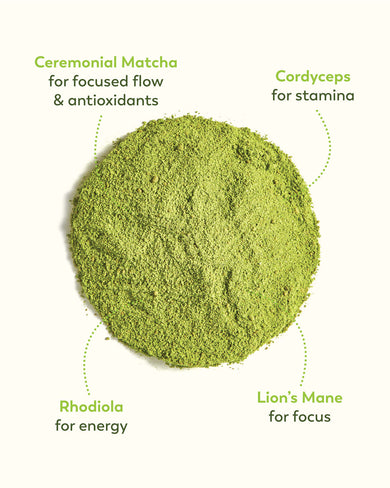 Coconut milk powder* (coconut milk,* tapioca maltodextrin*), matcha,* coconut sugar,* gynostemma extract,* cordyceps fruiting body extract,* lion’s mane fruiting body extract,* rhodiola extract,* & eleuthero extract*
